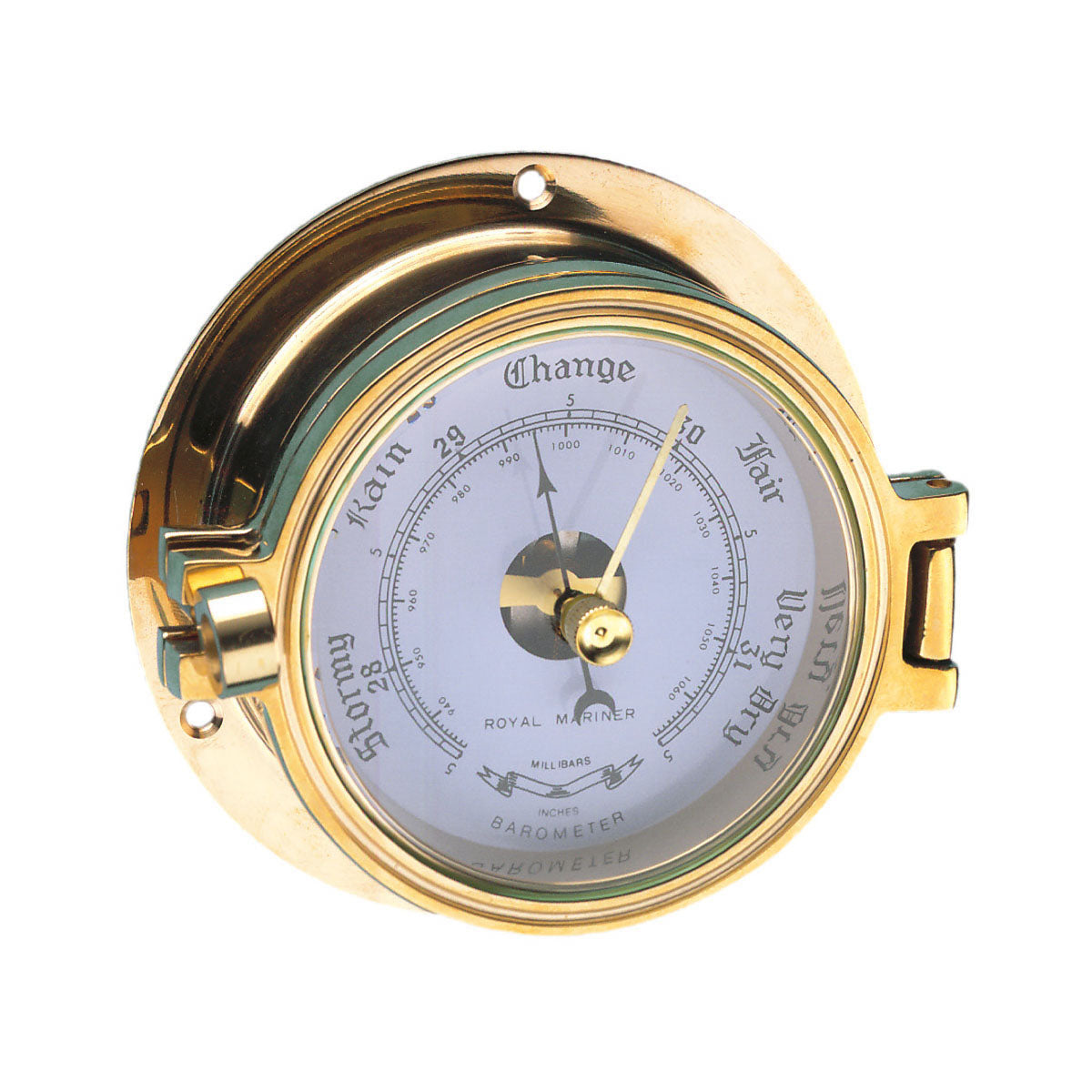 Dieses Barometer für Boote in Bullaugenform verfügt über ein weißes Zifferblatt mit klassischen Beschriftungen und Zahlen sowie einen beweglichen Zeiger, der hilft, Veränderungen des Luftdrucks abzulesen.