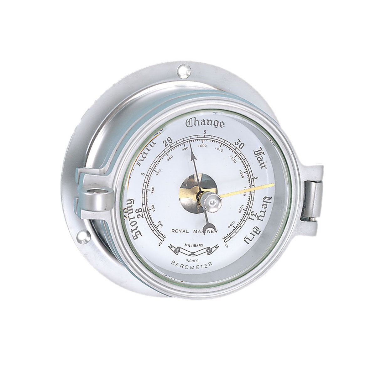 Dieses Barometer für Boote in Bullaugenform verfügt über ein weißes Zifferblatt mit klassischen Beschriftungen und Zahlen sowie einen beweglichen Zeiger, der hilft, Veränderungen des Luftdrucks abzulesen.