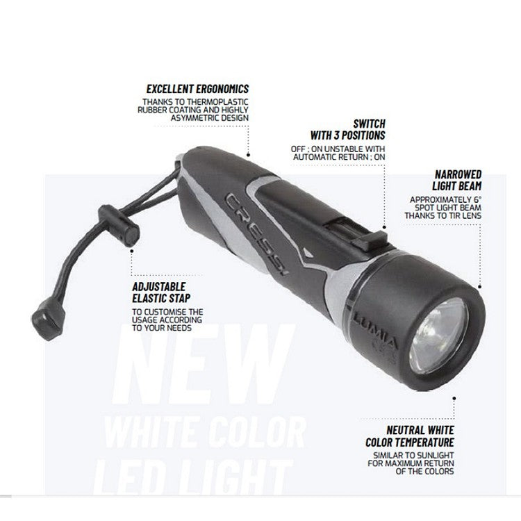 Die Temperatur der LED liegt im neutralen weißen Bereich, der dem des Sonnenlichts ähnlich ist, und sorgt für eine maximale Wiedergabe der Farben in der Unterwasserwelt. Der Lichtstrahl der LED wird durch eine Linse aus einem ultratransparenten Material auf einen Lichtstrahlpunkt von etwa 8° reduziert, die mit einer Haube aus optischem Polycarbonat geschützt wird. Die Batterien sind im Lieferumfang enthalten.