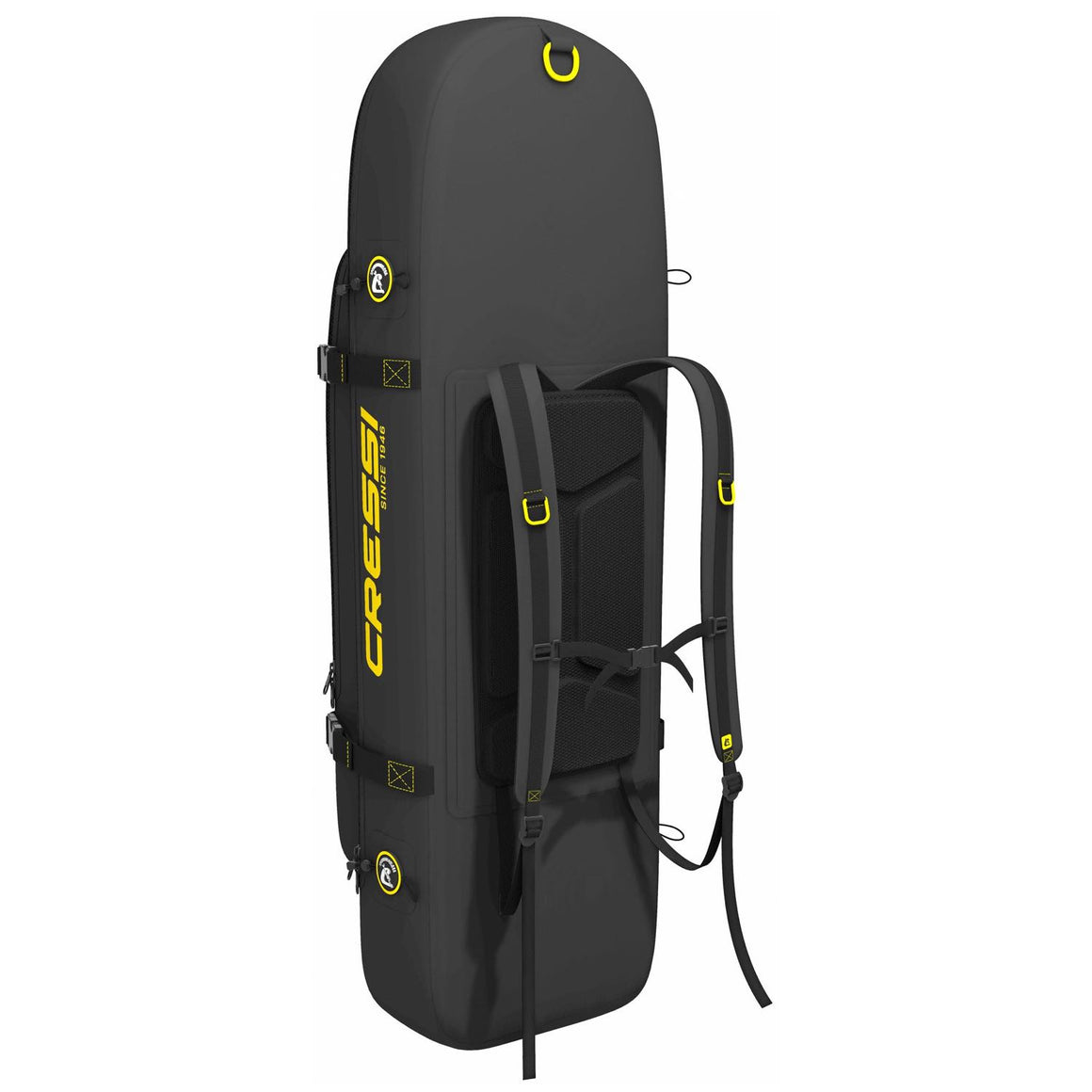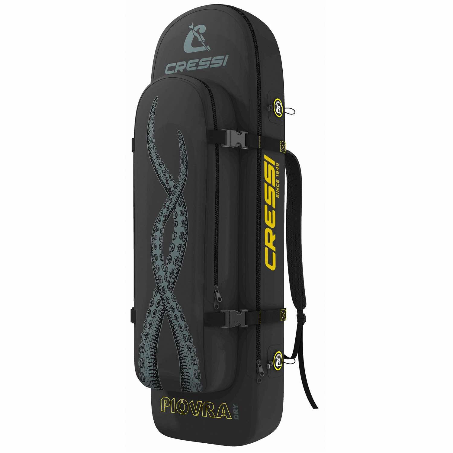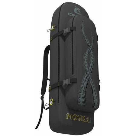 Die Piovra Rucksacktasche ist perfekt für Sportfischer- und Freitauchausrüstung. Sie besteht aus wasserabweisendem DRY-Material, ist aber nicht wasserdicht. Das Hauptfach mit atmungsaktivem, feuchtigkeitsabweisendem Netz am unteren Ende bietet Platz für Freitauchausrüstung wie Neoprenanzug, lange Flossen (bis zu 100 cm), Maske, Schnorchel, Gürtel, Messer und diverses Zubehör. Das Nebenfach, d.h. die Außentasche, ist wie eine Kühltasche für kalte Getränke oder Fisch. Die äußere elastische, geflochtene Schnur ermöglicht es, andere Gegenstände, wie z.B. ein Handtuch, darin zu verstauen. Die beiden Seiten sind mit Befestigungssystemen für zwei Harpunen ausgestattet. Am oberen Ende der Tasche befindet sich ein D-Ring. Die beiden Schultergurte zum Tragen sind verstellbar und ein seitlicher Griff erleichtert das Greifen. Der reflektierende Aufdruck auf der Vorderseite sorgt für bessere Sichtbarkeit. Das Hauptfach ist mit Ösen für ein Vorhängeschloss ausgestattet.