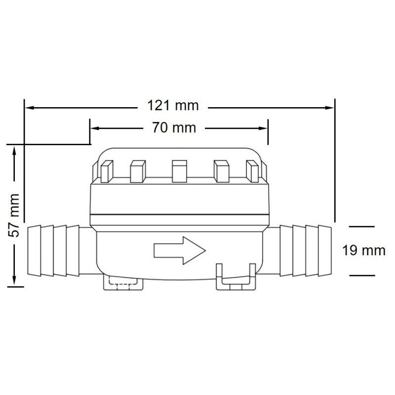 Linearfilter mit 40 Maschen pro Quadratzoll, ausgestattet mit 19 mm (3/4") Schlauchanschlüssen auf beiden Seiten. Ideal für Druck- und Hochdruckwassersysteme, geeignet für Trink- und Salzwasseranwendungen.