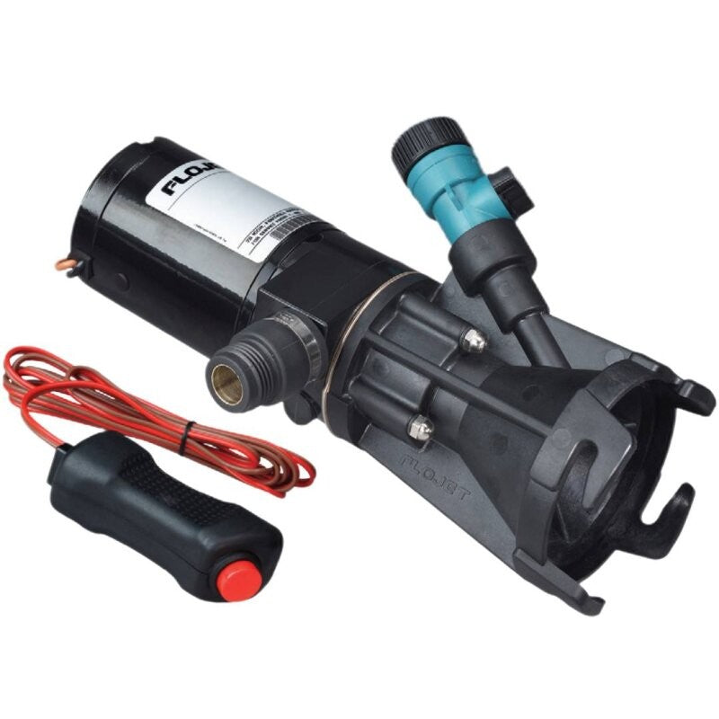 Tragbare Flojet Fäkalienpumpe 12V für Wohnwagen, entwickelt für das effiziente Entleeren von Abwassertanks, Toiletten und Klärgruben. Mit Edelstahl-Zerkleinerer, der Abfälle auf Partikel von bis zu 1/8" (3,18 mm) zerkleinert, sodass das Pumpen durch einen Gartenschlauch (mind. 5/8") möglich ist. Passend für Standardabläufe von 3" (75 mm) und mit 3/4"-Anschluss für Schlauchspülung und -auslass.