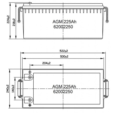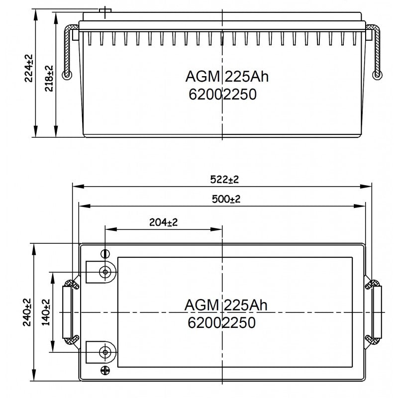 | 62002250 | 12 | 225 AH | 63 A | 1080 A | M8 | +/- SX | 522X240X224 mm | 62,5 KG |