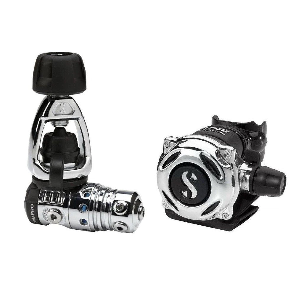 - Die erste Stufe mit luftbalanciertem Kolben in einem verchromten Gehäuse liefert einen gleichmäßigen und mühelosen Luftstrom, unabhängig von Tiefe, Flaschendruck oder Atemfrequenz.