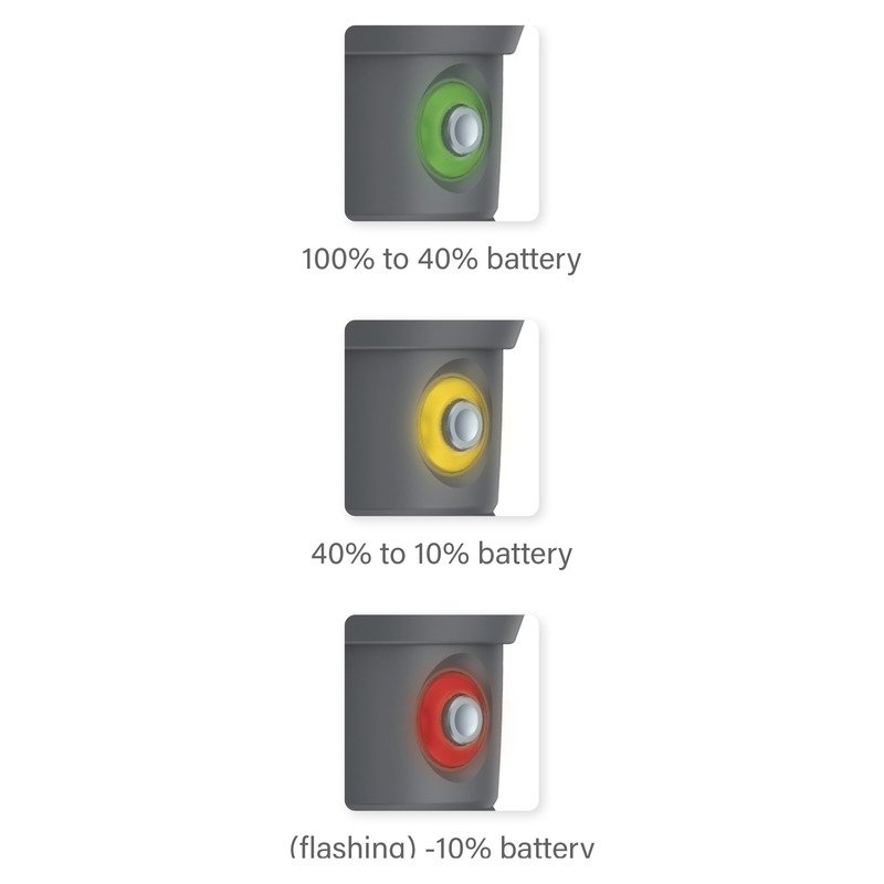 Der schalter hat einen leuchtenden ring, der grün leuchtet, wenn der akku geladen ist, gelb, wenn der akku halb geladen ist, und rot blinkt, wenn der akku schwach ist.
