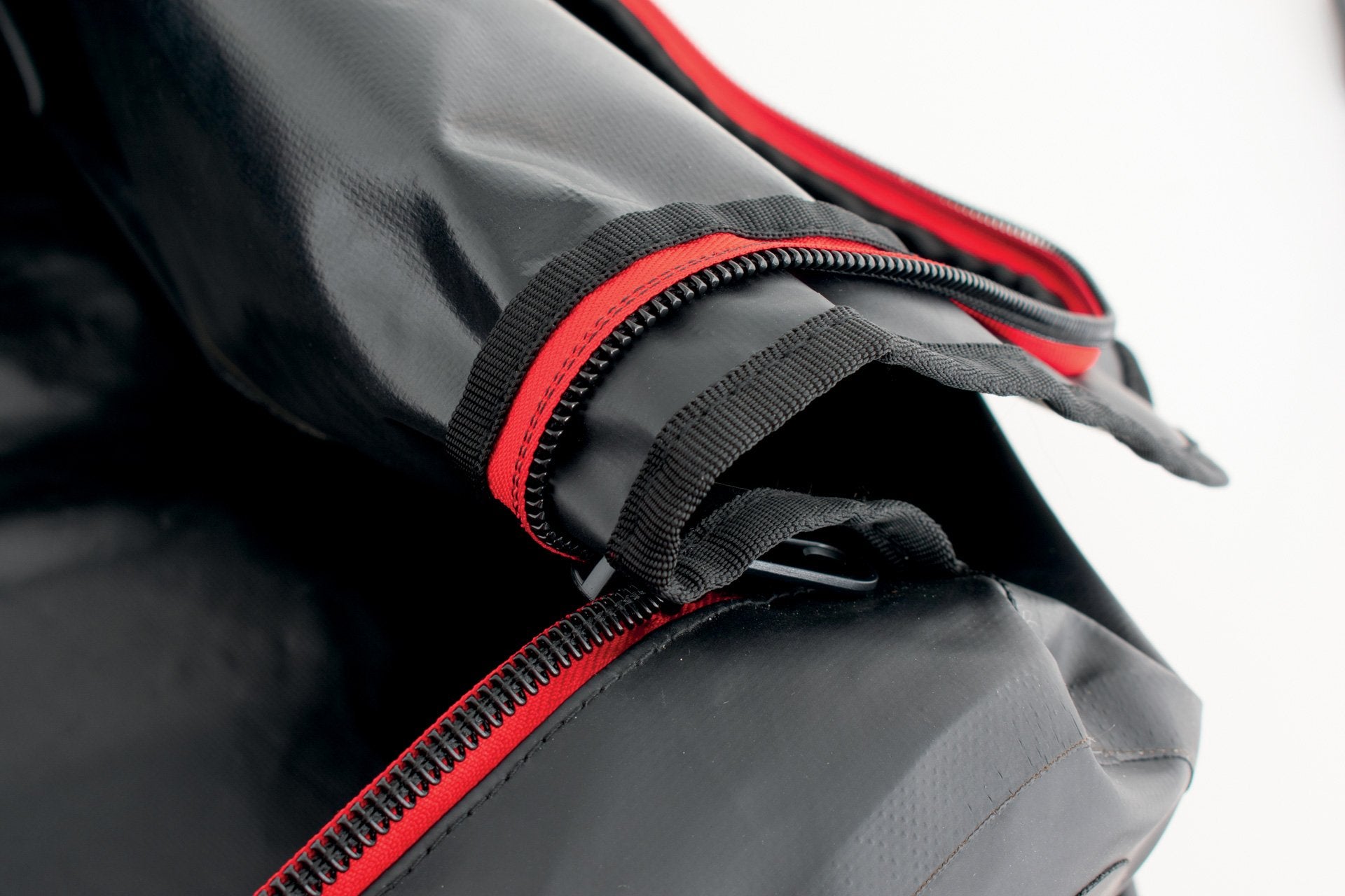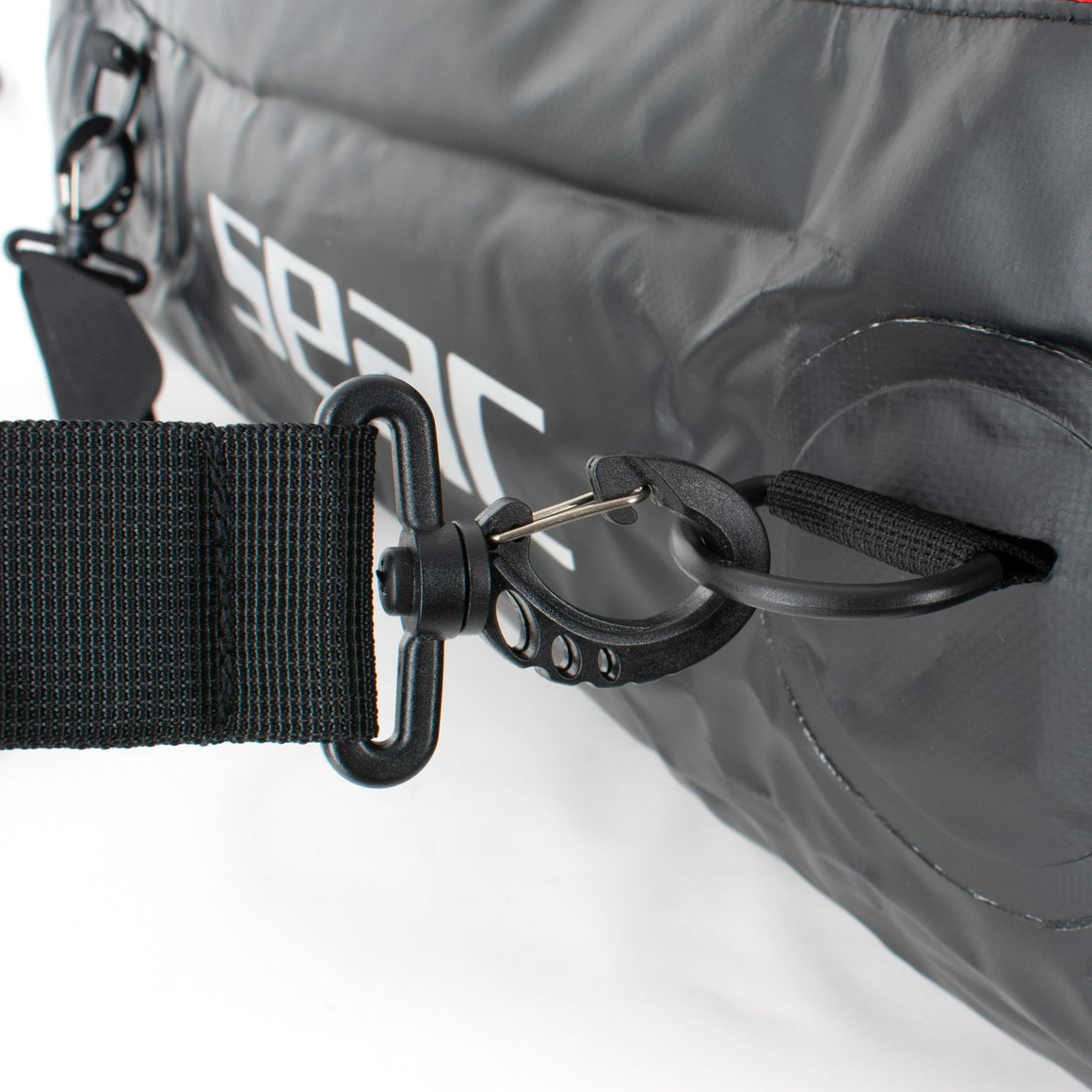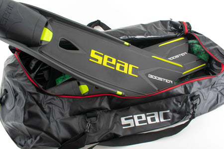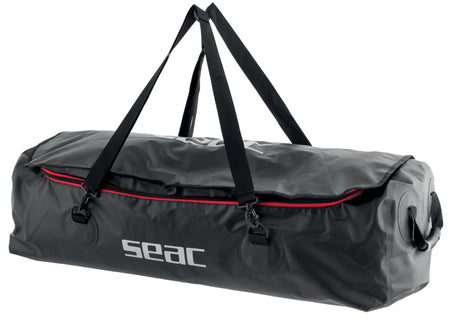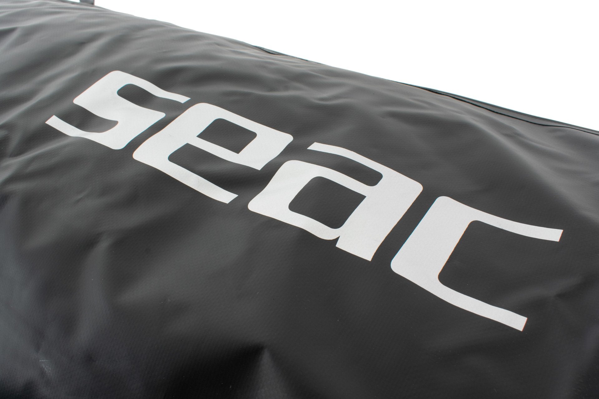Trockentasche. Geräumige wasserdichte Tasche aus Tarpaulin. Die technische Struktur der Tasche ermöglicht den Transport von sowohl trockener als auch nasser Ausrüstung. Bei letzterem ist es möglich, vor dem Transport mit frischem Wasser abzuspülen. Eine spezielle Kappe leitet das überschüssige Wasser von der Rückseite ab. Jeder Taucher weiß, dass es einen großen Unterschied gibt zwischen einer Tasche, die für Tauchaktivitäten verkauft wird und einer Tasche, die für die Bedürfnisse dieses speziellen Sektors studiert und entworfen wurde. Geräumigkeit und Robustheit, starke Materialien und Details, wasserdichte und atmungsaktive Stoffe, Rationalität und Kompaktheit in der Form, praktisch zu transportieren und leicht zugänglich, komplett mit Zubehör und funktionell, sind nur einige der wichtigen Eigenschaften, die Seac den eigenen Produkten verleihen will