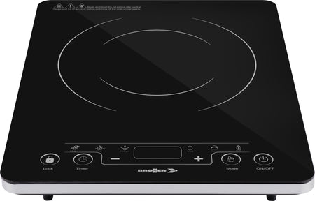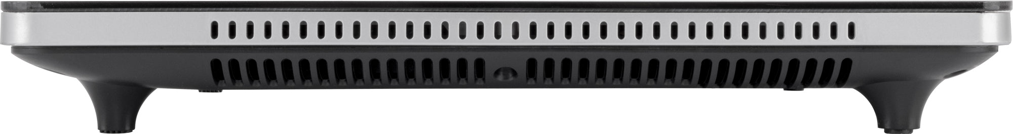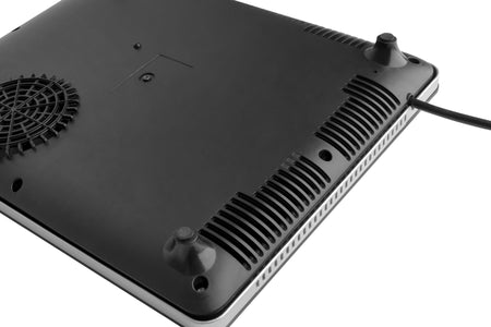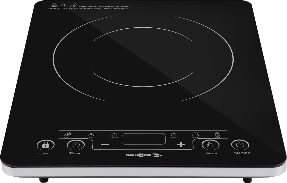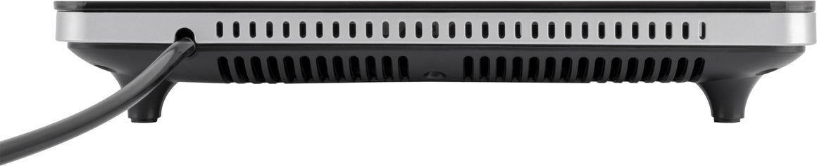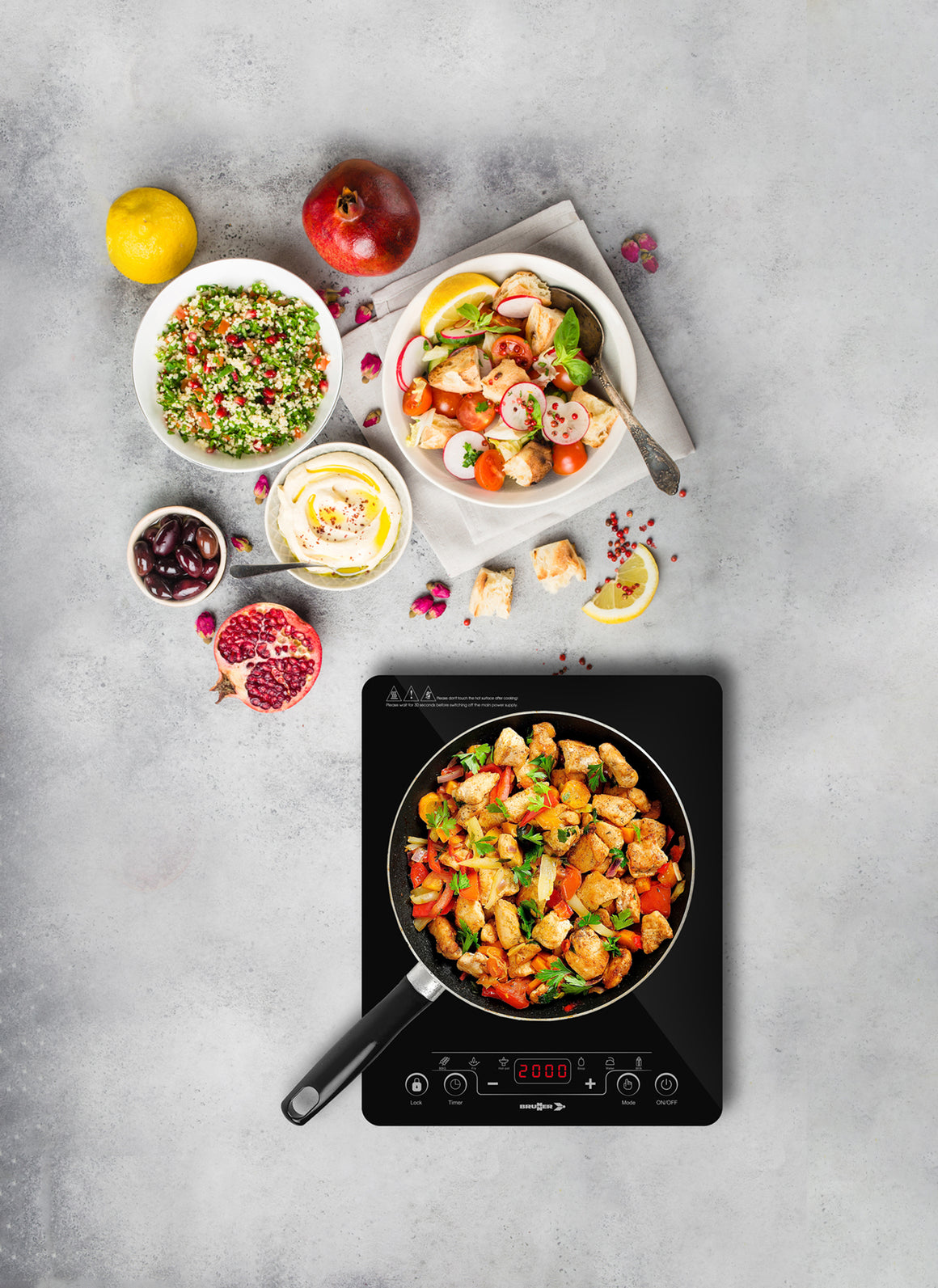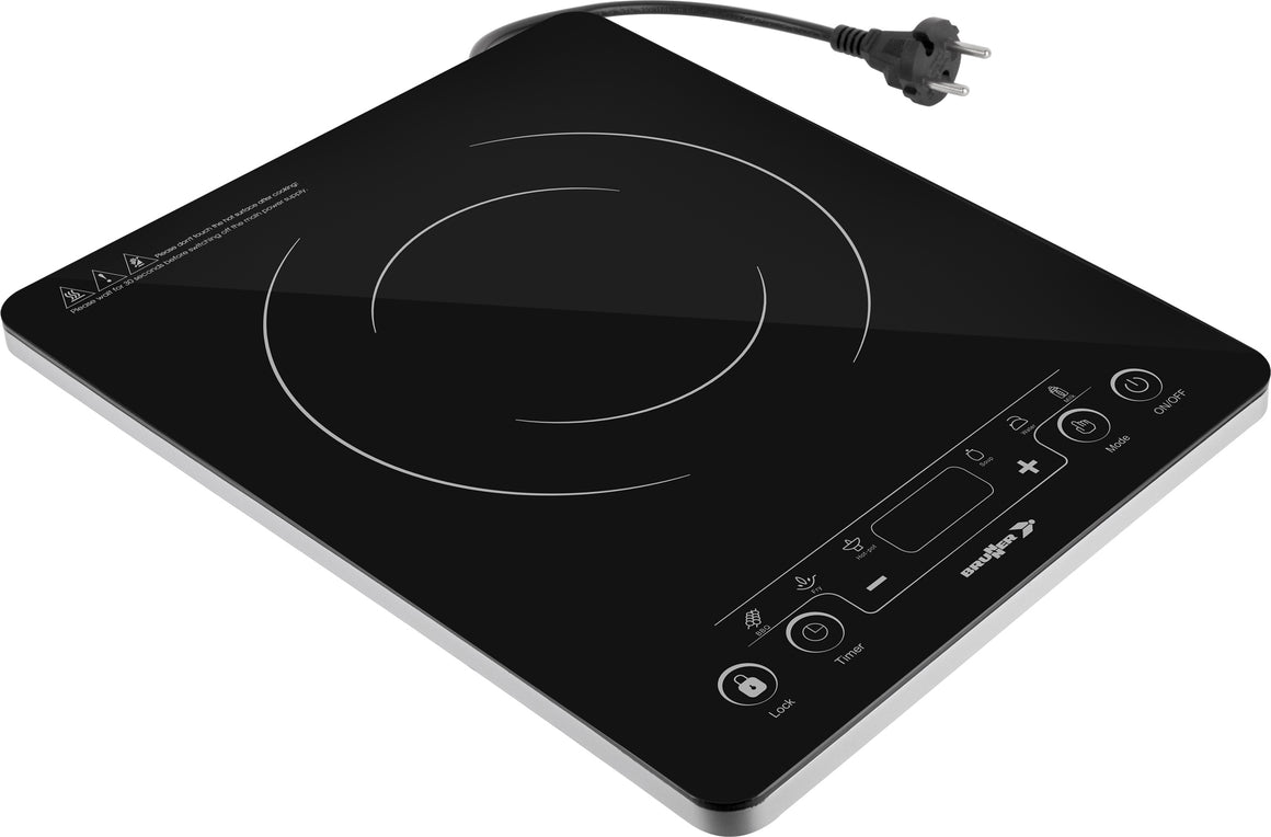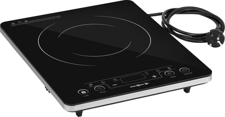 Portable heat induction plate with PP housing and high-strength glass ceramic cooking surface. Perfect for outdoor and camping use thanks to low weight and 9 power levels (300 - 2000 W), selectable via touch control switch and LED display.
