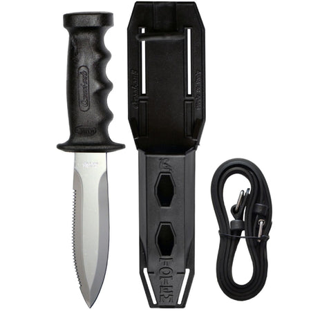 The plastic sheath holds the knife firmly with a traditional elastic band and has loops to attach it to the leg or strap. The knife comes with two, standard issue straps to attach it to your leg.