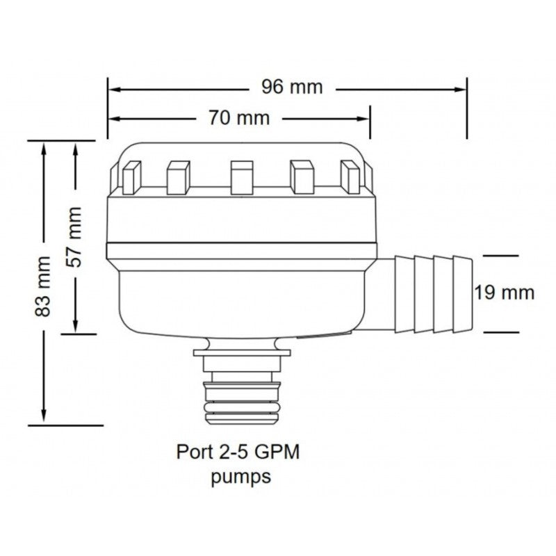 Flojet hose barb filter 3/4" with 90° design, equipped with 40 mesh and 19 mm (3/4") hose inlet. Male quick-connect outlet, compatible with 2–5 GPM pumps.