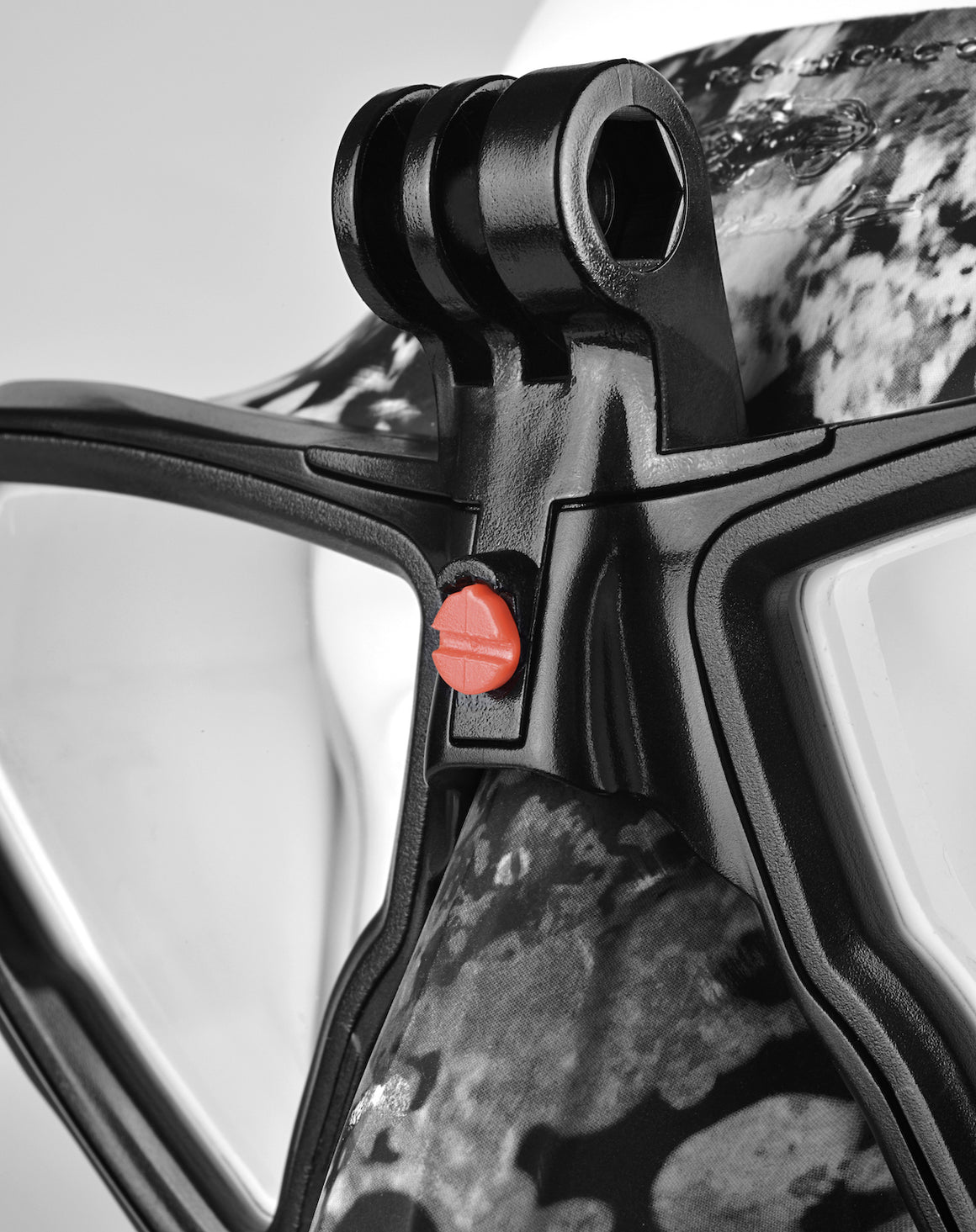 Sistema para montar una cámara en la parte superior de la máscara Element. La parte superior de la máscara puede retirarse fácilmente y sustituirse por este soporte para cámara. La montura, fabricada en policarbonato, tiene un pasador de seguridad de bayoneta con cola de milano.