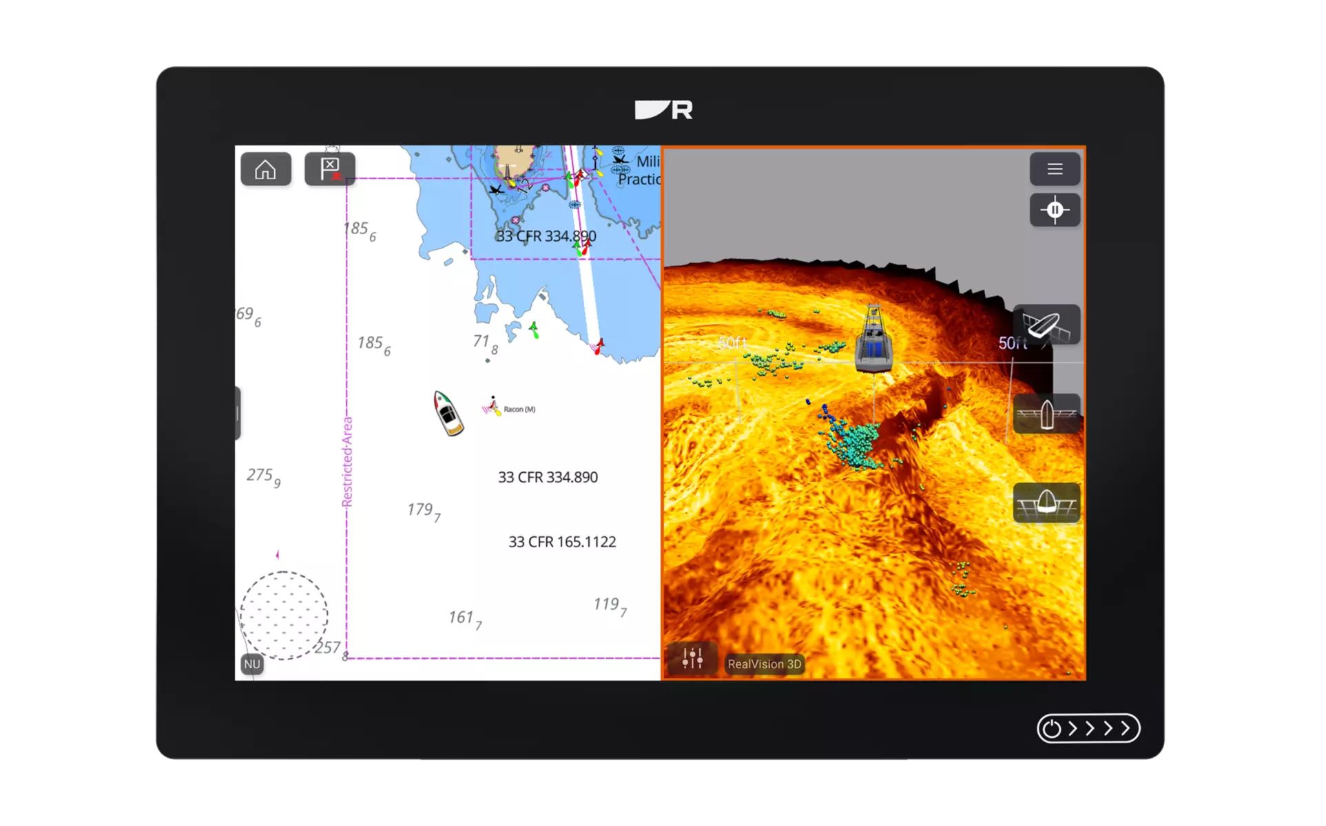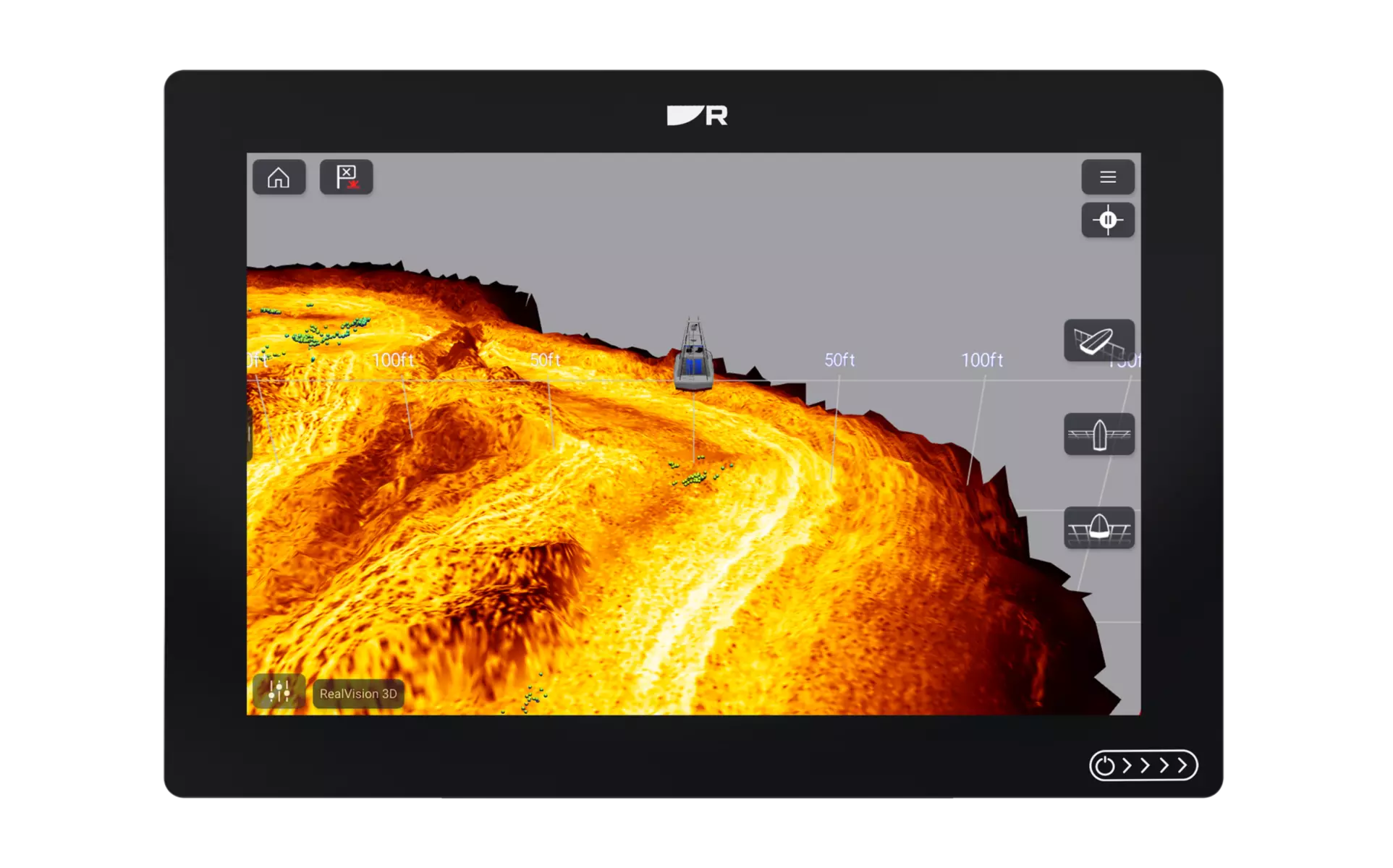 - RealVision 3D que proporciona un modelo batimétrico con estabilización giroscópica GPS del fondo y de la columna de agua