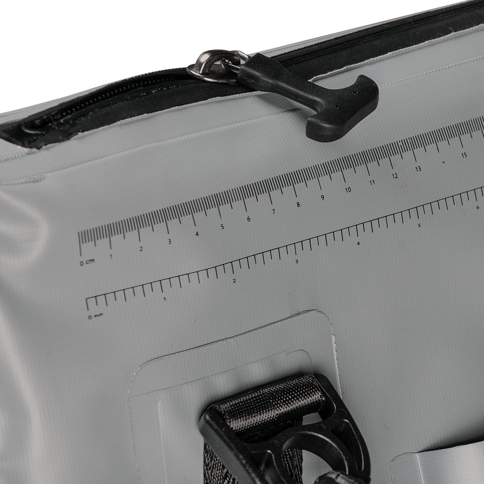 - Cierre de cremallera estanca y válvula de drenaje de agua. Bandolera y asas para transporte, ojales para fijación durante el transporte. Escala graduada exterior en cm/pulgadas para la medida de la captura.