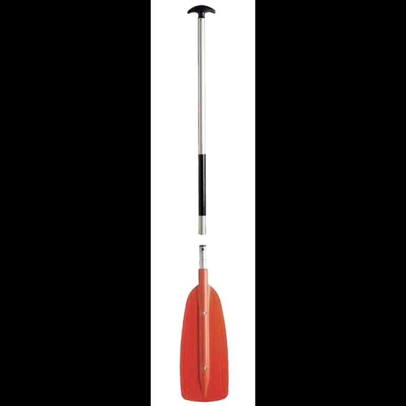 Pala divisible en aleación ligera anodizada, tubo Ø 30 mm, hoja en ABS roja. Longitud total 150 cm, desmontada 88 cm. Peso 850 g.