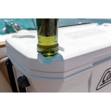 Dotée de charnières en acier inoxydable, de poignées solides, d’un couvercle avec porte-gobelets et assez robuste pour supporter 110 kg. Intérieur antimicrobien facile à nettoyer. Équipée d’un bouchon de vidange.