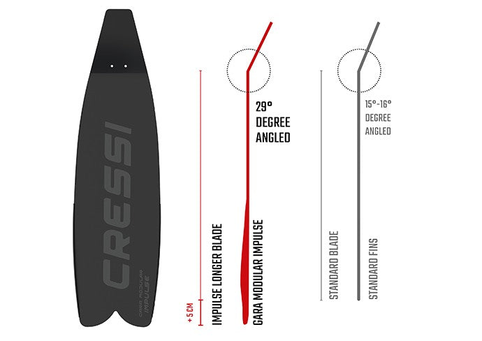 La voilure de la Gara Modular Impulse complète la gamme de palmes Cressi, intégrant un angle de pli de 29 degrés, qui permet d’augmenter encore la performance dynamique du battement.