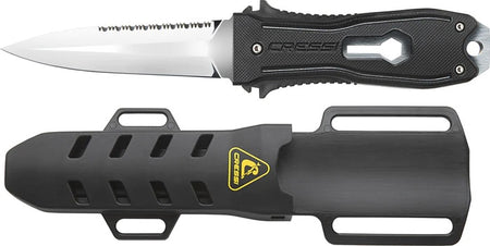 Couteau de plongée professionnel multi usages, réalisé en italie avec une lame et un manche en acier inoxydable martensitique w 1. 14116, dureté hrc 55/56, pour obtenir un fil extrêmement affilé et coupant. Un couteau avec un manche de poignard conçu spécifiquement pour la pêche. Dans le corps du couteau, une partie est destinée à l’extraction des flèches tordues et à leur redressement. Le couteau peut être retiré de son fourreau rapidement et d’une seule main grâce à un système mécanique spécial