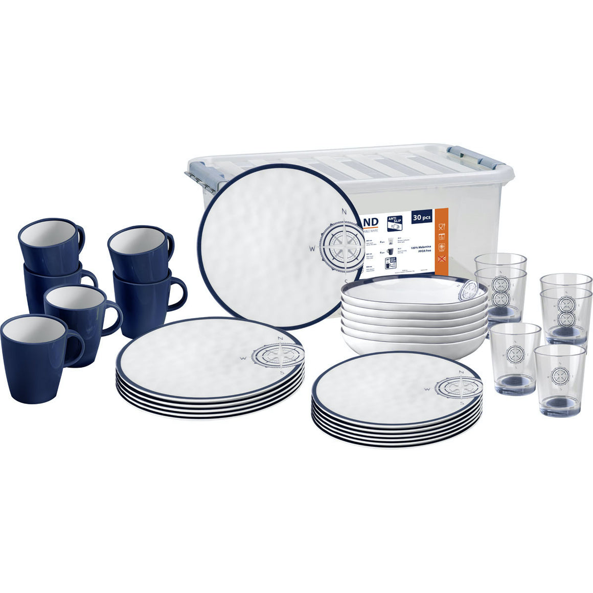 La vaisselle est fabriquée en mélamine alimentaire de haute qualité ; les tasses en reslyn, un matériau thermoplastique 100 % sans BPA, caractérisé par d'excellentes propriétés isolantes et utilisable jusqu'à 95°C ; les verres en SAN transparent très brillant.