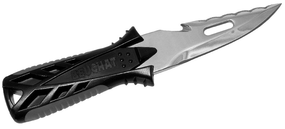 > Lama a doppio taglio 83x4mm acciaio inox con tagliasagole > Custodia con doppia chiusura di sicurezza. Manico dotato di impugnatura morbida e di una guardia di protezione > Fornito con i kit di fissaggio per giubbotto stabilizzatore e frusta DS