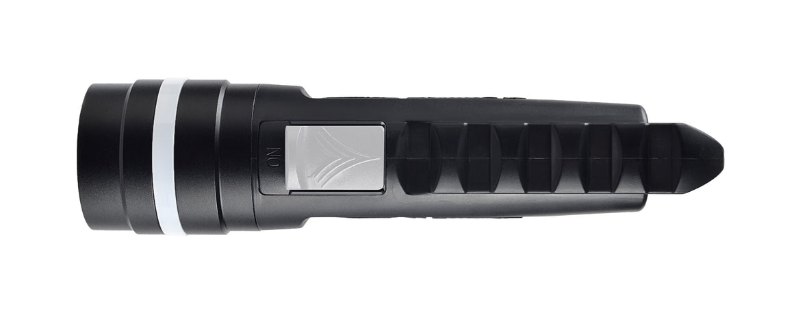 Pratico interruttore a scorrimento ON/OFF, con LED interno che segnala lo stato di carica (lampeggiante durante la ricarica, fisso a carica completa). Dotata inoltre di ghiera di sicurezza rotante o removibile per evitare accensioni accidentali durante il trasporto.