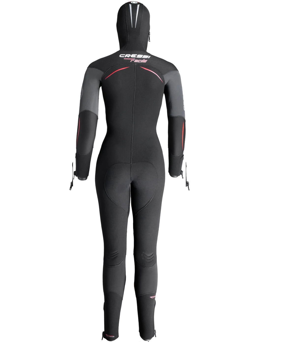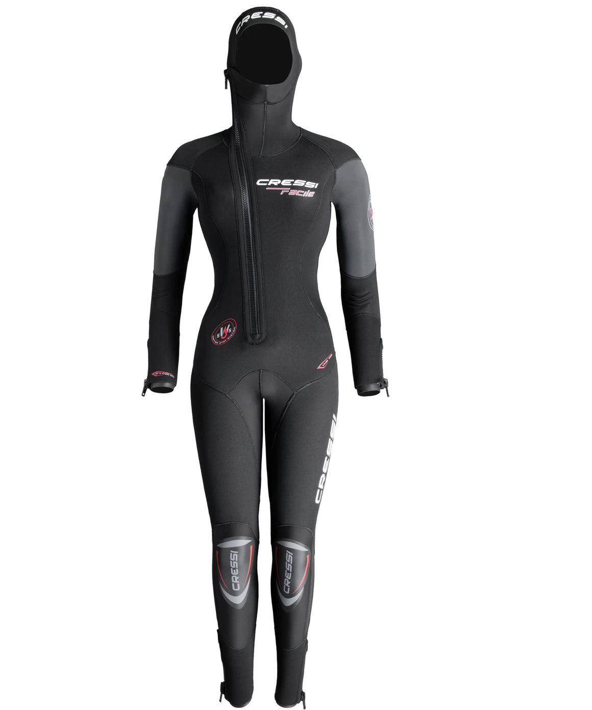 Muta umida monopezzo con diversi spessori (8, 6 e 5 mm) e cappuccio per acqua fredda.