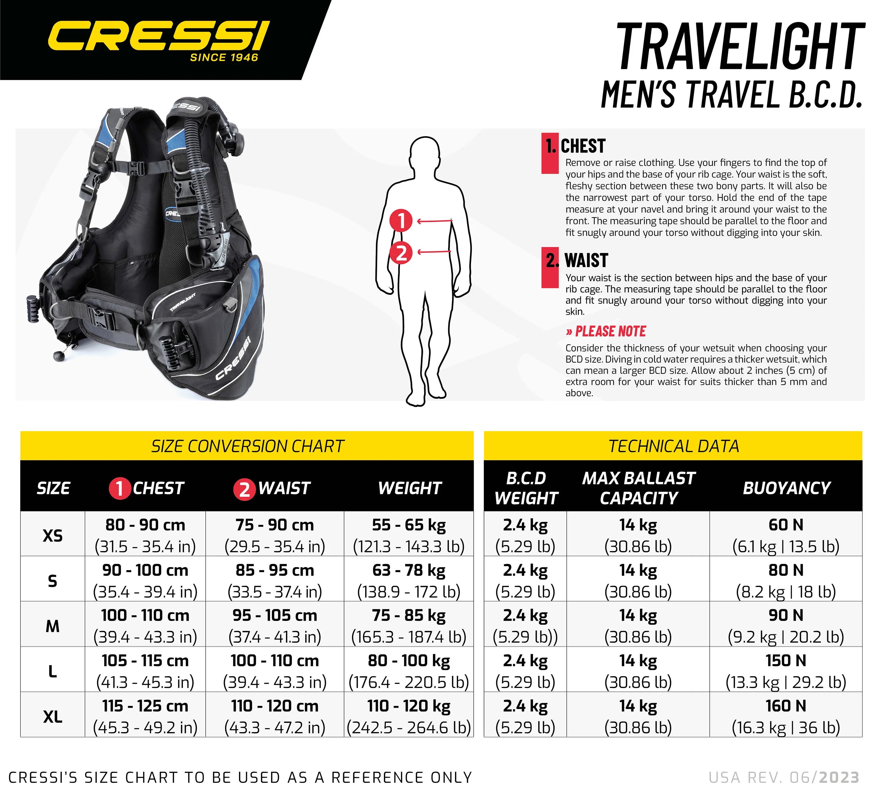 Disponibile nelle taglie da XS a XL, il Cressi Travelight offre diverse capacità di spinta di galleggiamento per adattarsi a differenti corporature e configurazioni di attrezzatura subacquea.