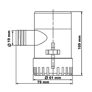 Pompa di sentina ad immersione portata 550 GPH Fabbricata in Abs antiurto. H 93 mm. Consumo di energia 2,5 A/ora. Provvista di basetta a scatto per l’eventuale ispezione o pulizia. Altezza geodetica 3,80 mt.