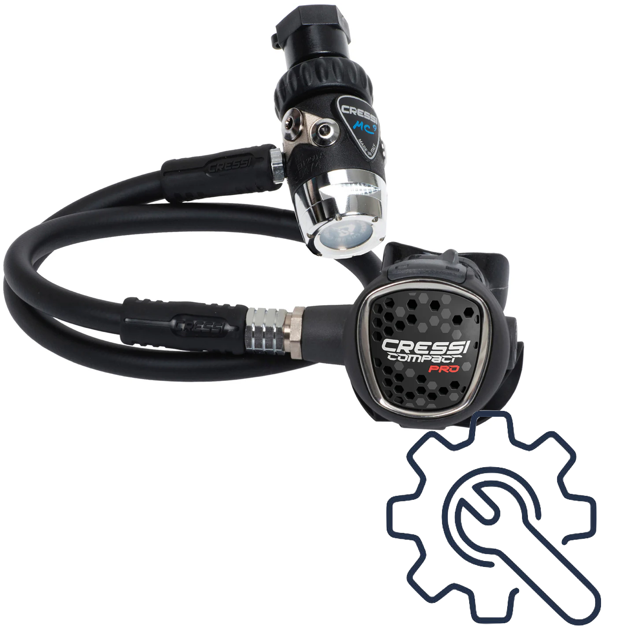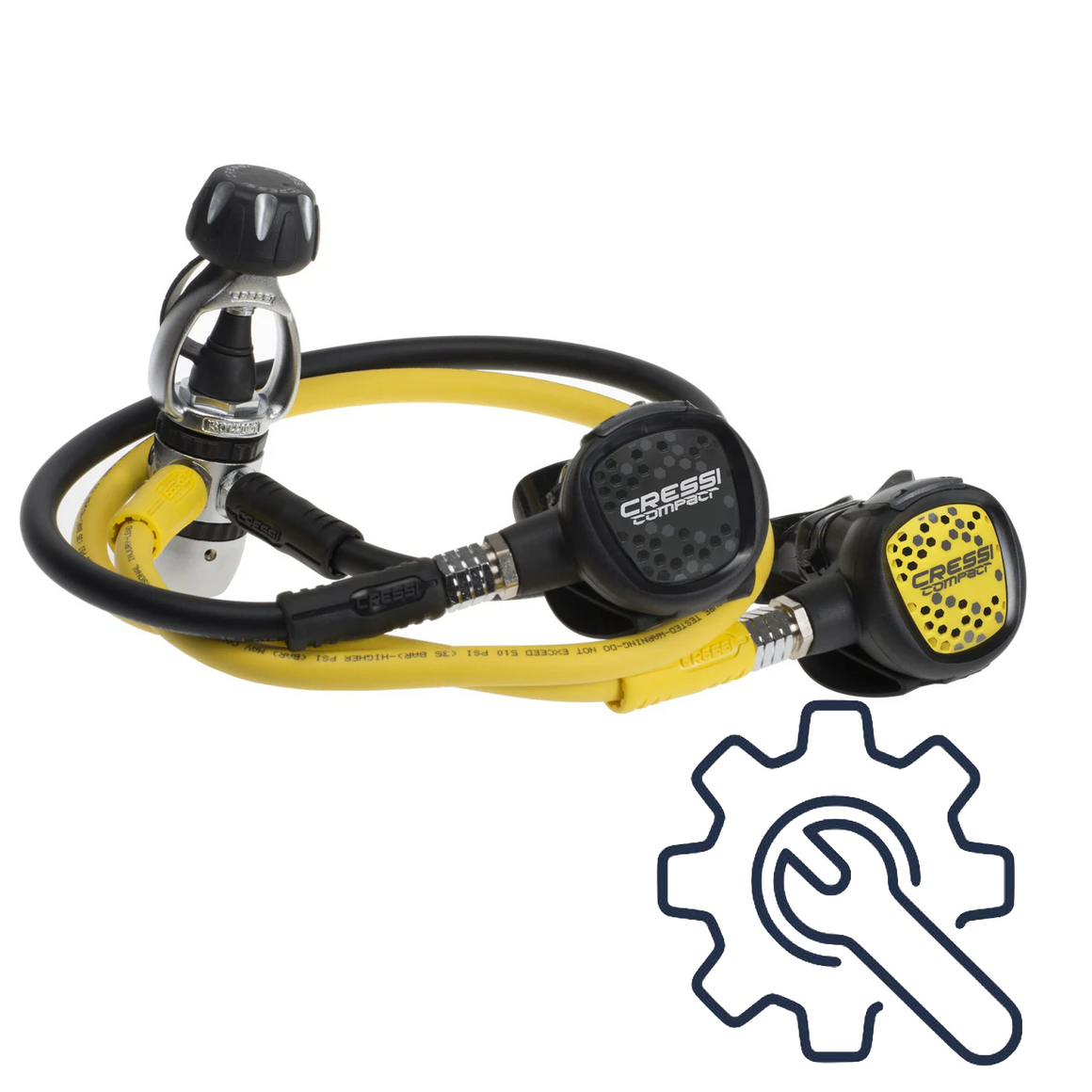 Servizio di revisione e manutenzione certificata per erogatori Cressi presso centro tecnico autorizzato Cressi. I servizi includono ispezione completa, test funzionali e manodopera specializzata. Disponibili configurazioni per primo e secondo stadio oppure erogatore completo (primo stadio, secondo stadio e octopus)